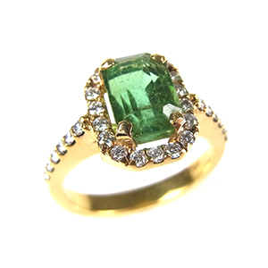 Modern 18ct yellow gold green tourmaline and diamond ring. The emerald cut green tourmaline in a four claw setting surrounded by eighteen claw set round brilliant cut diamonds to shoulders set with a further twelve claw set round brilliant cut diamonds, all mounted with plain, polished, D-section shank.